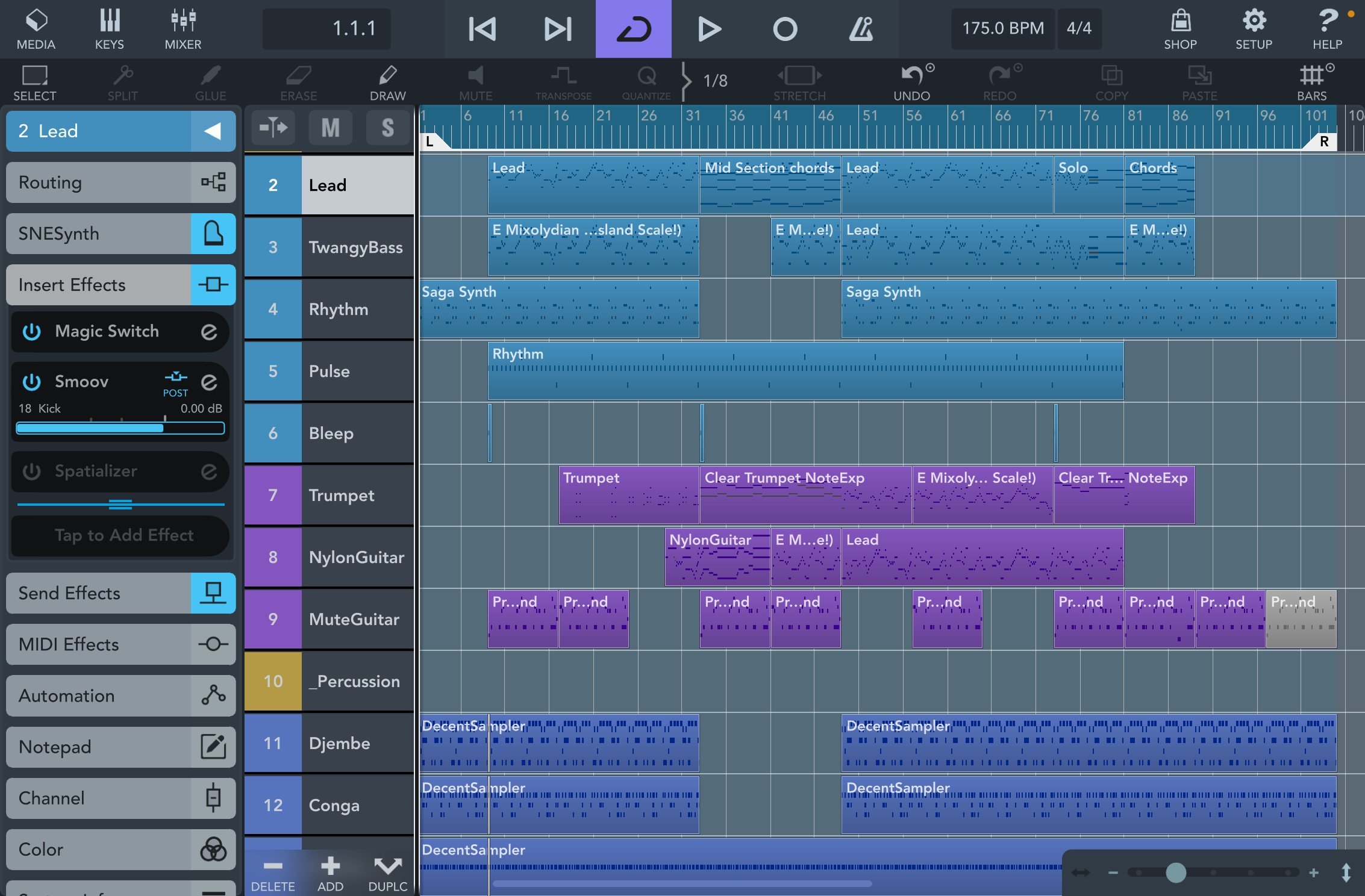 | Smoov | Gentle compression (algorithm based). Used this specifically to sidechain the main synth lead to the kick; subtle effect but it made the difference to let the kick punch through the mix. | AUv3 |